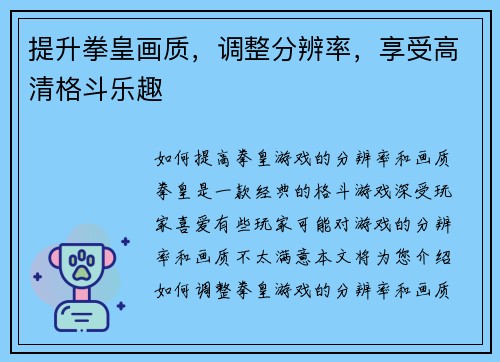 拳皇如何调整分辨率 拳皇是一款经典的格斗游戏,受到了广大玩家的喜爱。在一些情况下,我们可能需要调整游戏的分辨率,以获得更好的游戏体验。本文将详细介绍拳皇如何调整分辨率的方法和步骤。 1. 调整分辨率的...